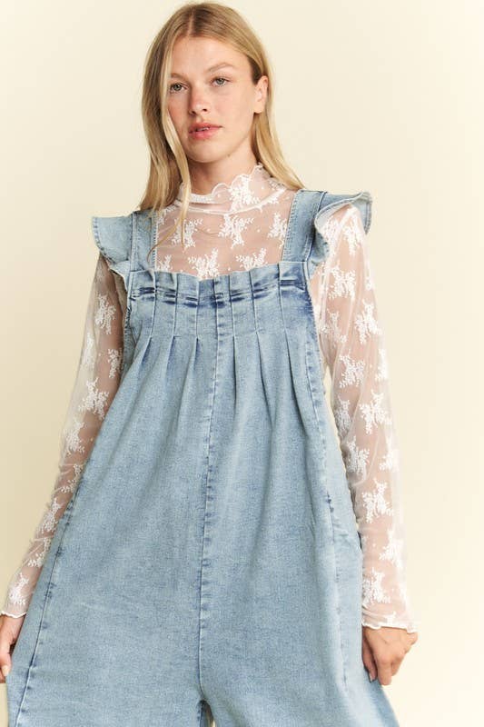 FLUTTER SLEEVE SQUARE NECK PINTUCK DENIM JUMPSUIT -Pleated -2 Side Hip Pockets -Wide Leg Body -Flutter Sleeve -Square Neck