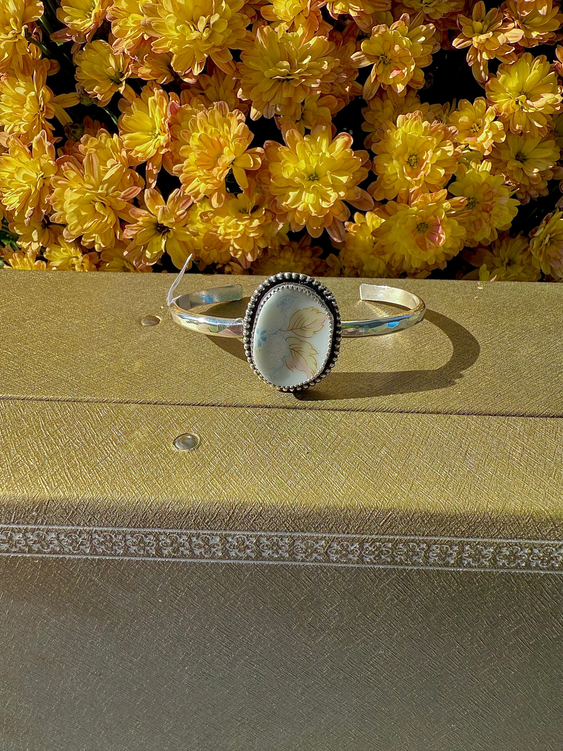 cut porcelain plate featuring a beaded border. Cuff slightly adjustable